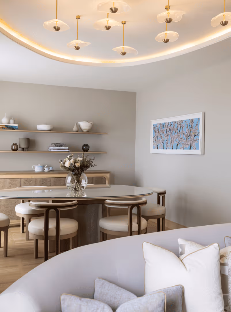 The colour palette and materiality took inspiration from the natural world with an emphasis on organic forms and textures. Natural grains in timbers and stones were utilised throughout the space providing depth and tactility, whilst soft hues of peach and blue reflected the warmth of the summer sky. The ultimate aim was to create an aura of tranquillity with playful touches, a welcoming and homely space offering escapism nestled amongst the rooftops of central London.
