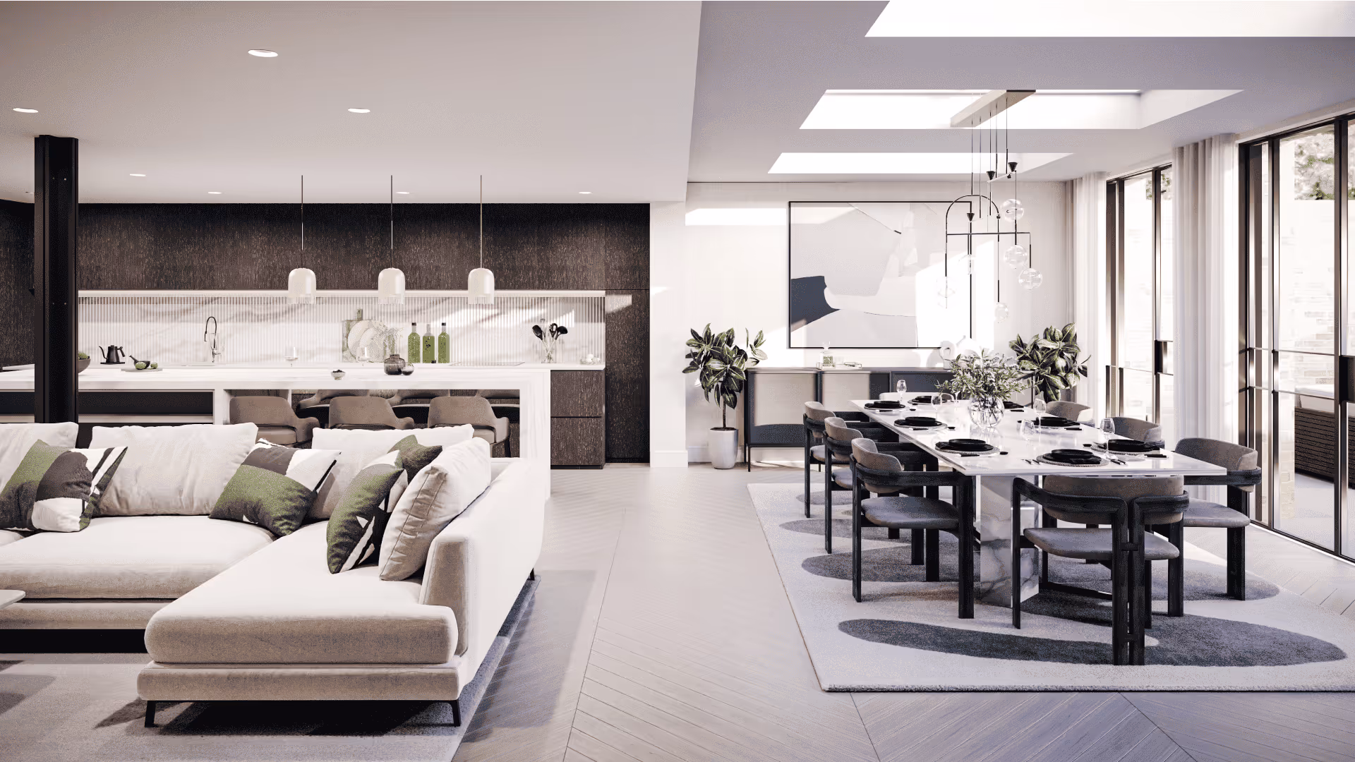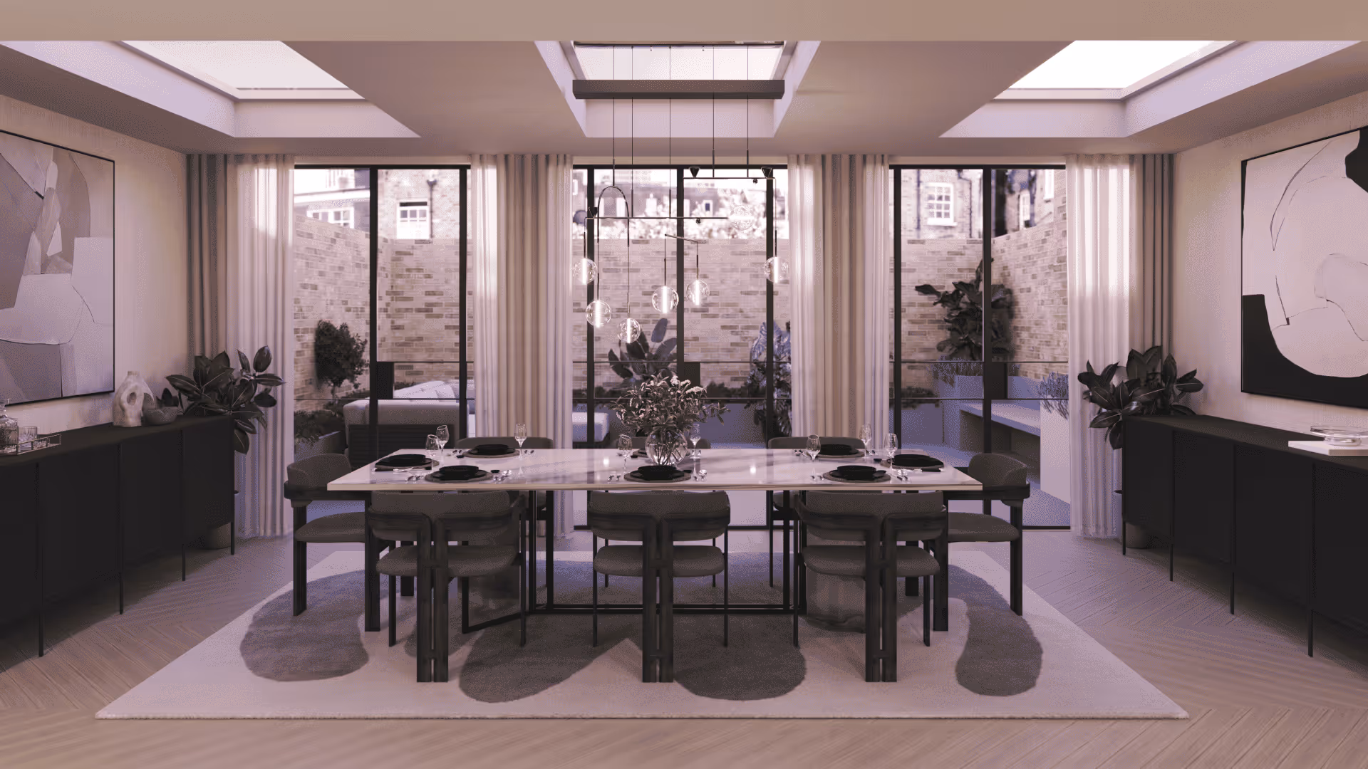 The design of the extension not only adds valuable net internal area to the existing building but also attracts further natural light into the space which is proposed to be the family living/dining room. The design is also sympathetic to the various architectural orders, from the brick recess of the extension to the restoration of existing architectural details. The interior design of the scheme mainly consists of neutral colours layered with refined accents such as Sage green, in the typical Rigby & Rigby style of refined luxury, paying particular attention to finishes, detailing and materiality to create the desired outcome. We are working closely with an award-winning landscape architect to deliver the important link and consider the external environment.