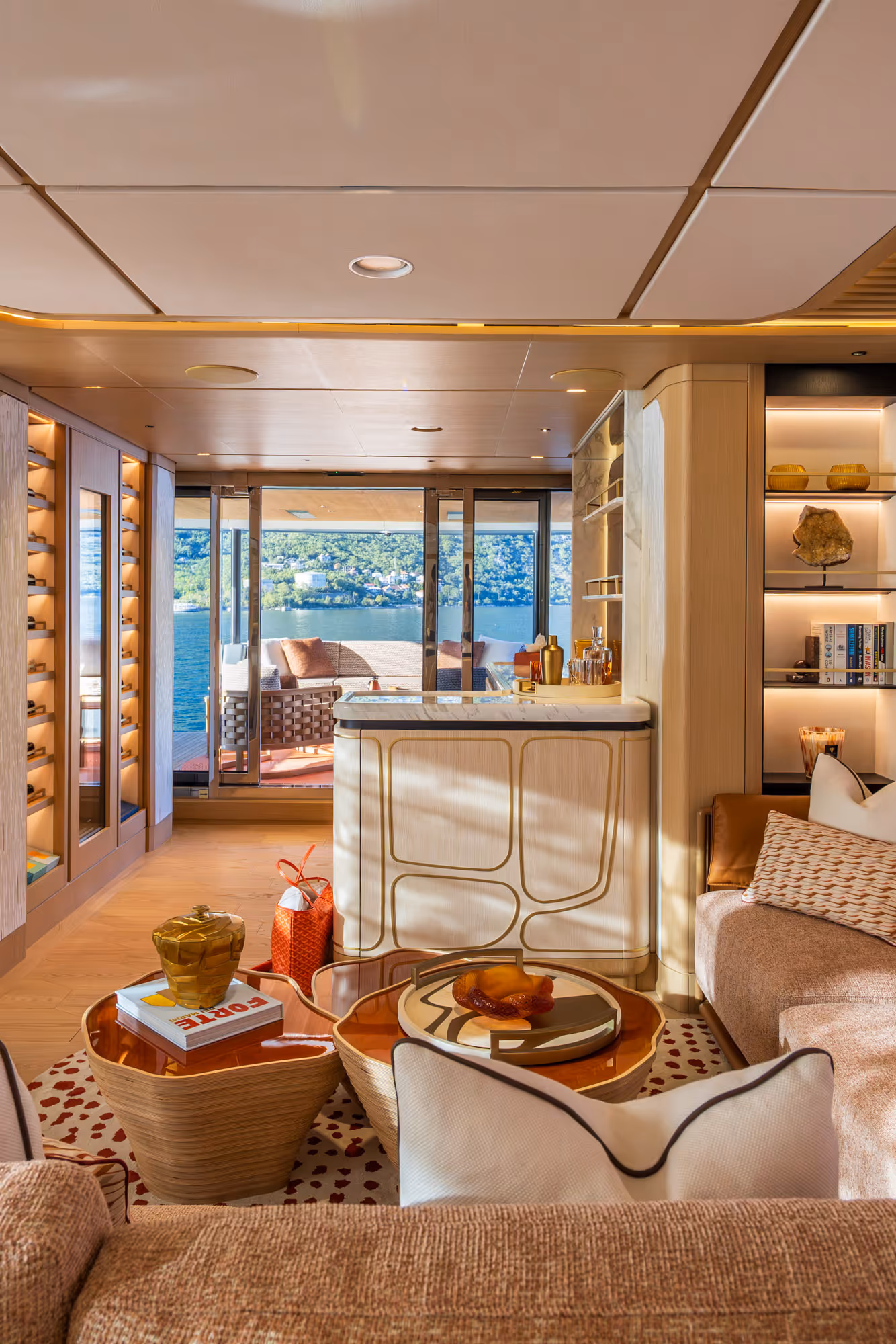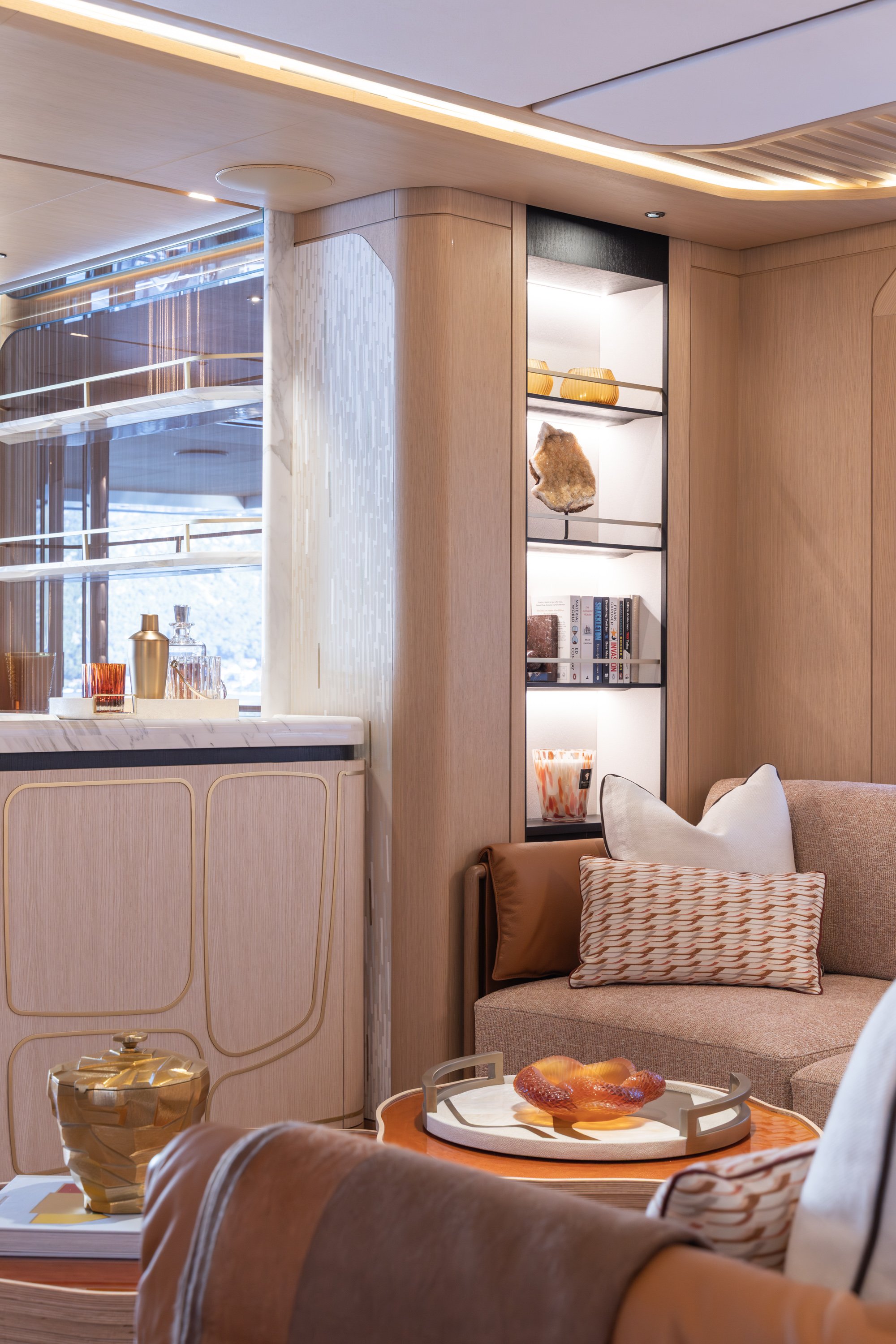 Designed as a deeply personal yacht, Haze II reflects the owner’s collected inspirations and ideas, translated into an interior of refined craftsmanship and detail. Warm timbers, specialist finishes, hand-painted wallpapers and curated lighting pieces form a cohesive aesthetic, with consistent architectural detailing giving each space character while maintaining an overall harmony.