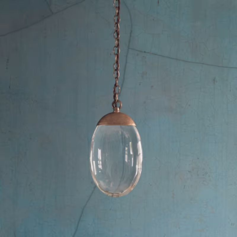Chosen by Rebecca Dix for its "organic and raw metal finish" This pendant with solid glass drop illuminated by LEDs, is fitted with cap and chain in antique brass, satin nickel or blackened nickel finish.