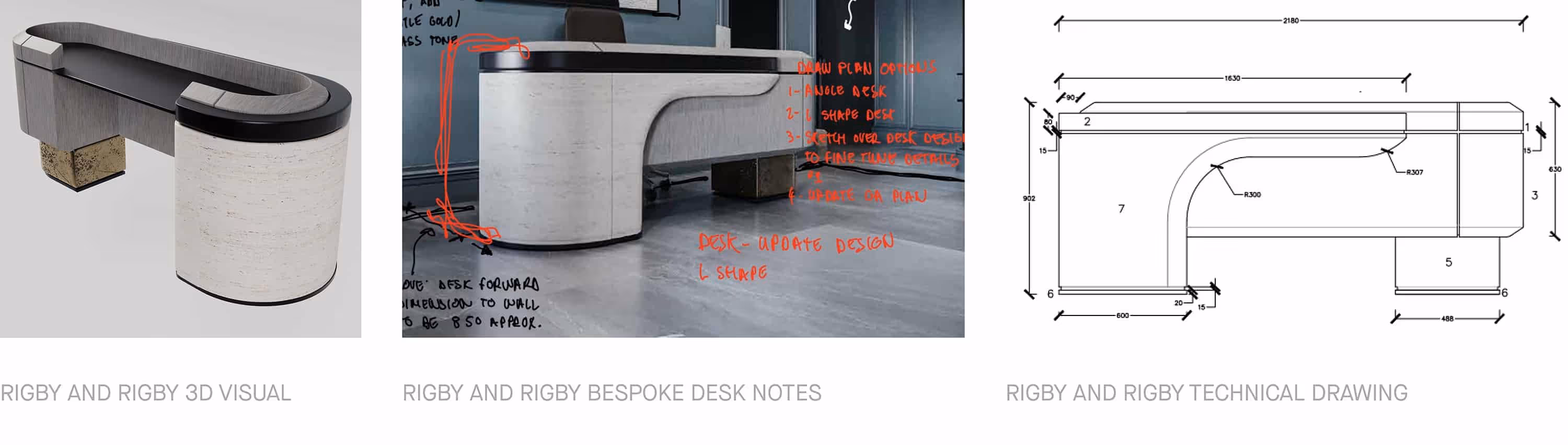 In many ways, we use methods similar to the 16th-century Japanese artists. We think back to things we have seen before, refer to samples, use intel from designers, and, refer to other work. When modelling new furniture, we can’t always get hold of technical drawings or dimensions when we need them. We just have a few reference images or sometimes concept sketches from designers. This bespoke desk below was designed by George Wolstenholme (Creative Lead at Lawson Robb) and we developed it over time in 3D to get to the final design for one of our projects, Mount Street. There was a combination of sketches, verbal communication and some elements drawn in CAD to work with.