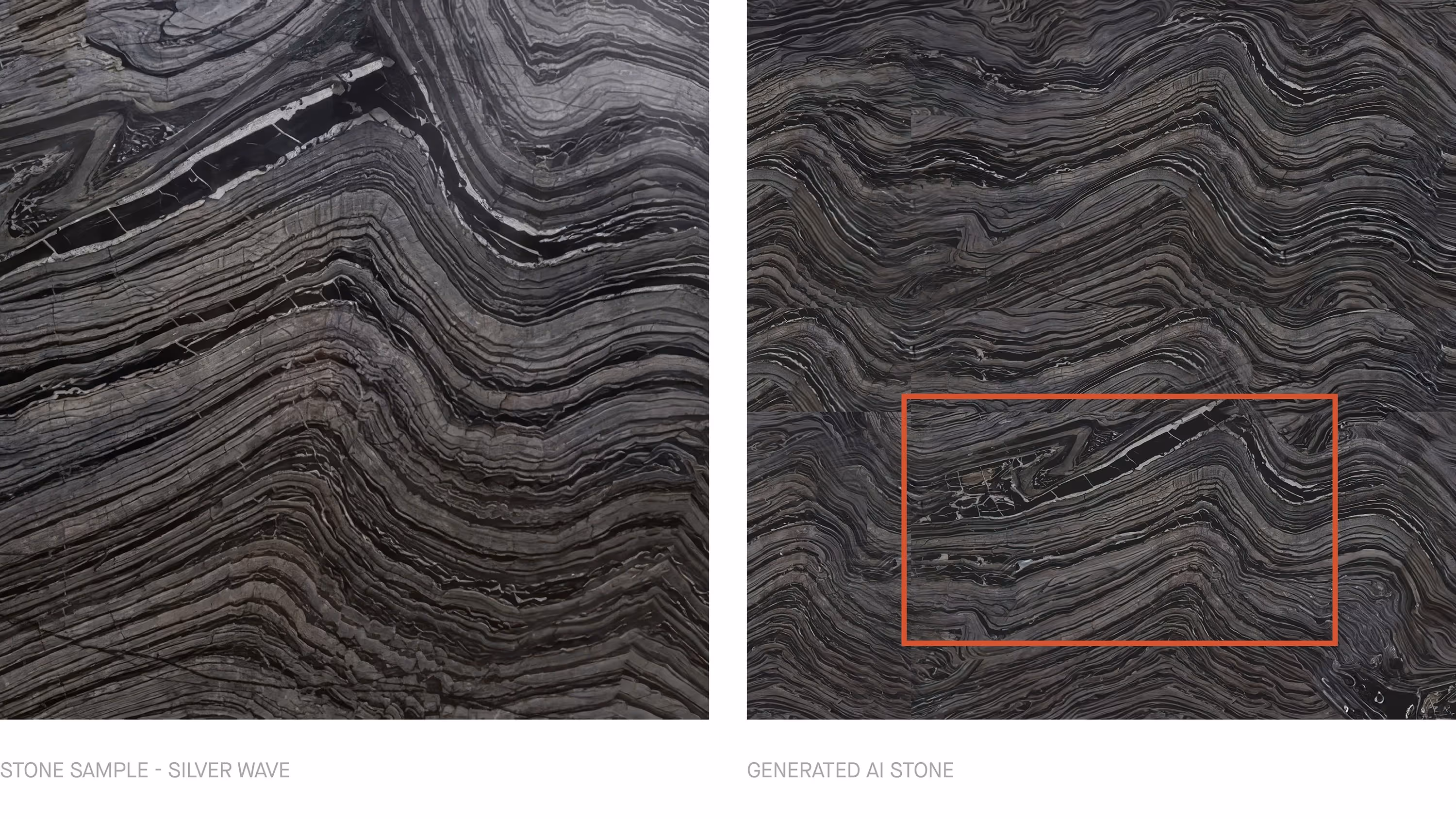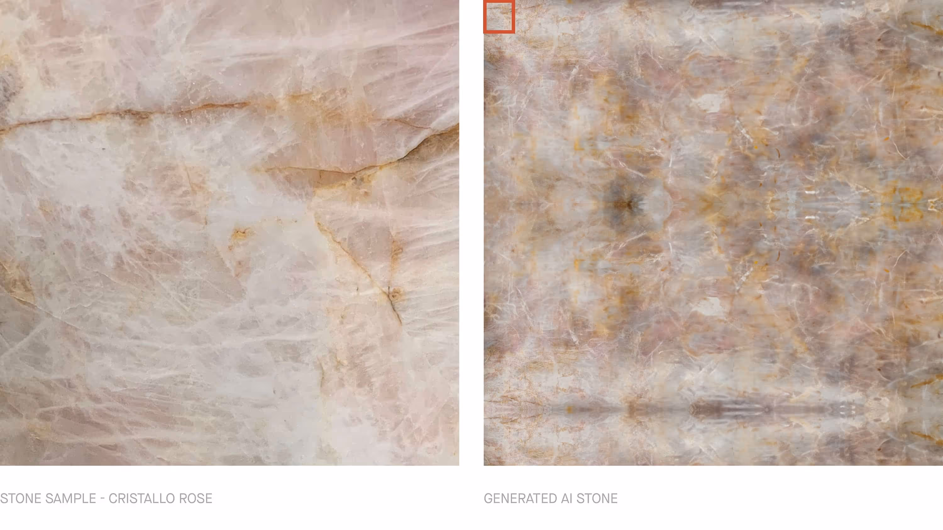 Now, although we sometimes still need to manually create stones for accuracy, a new feature in Photoshop helps us generate larger-scale images using the original image as a reference. The new AI feature within the software is a valuable tool to help us overcome the risk of a repeat pattern, and in turn, makes our visuals much more realistic. For example, the image above on the right was generated with AI using the reference image on the left. When applied to our visual below you can see there is no tiling effect and the scale suits the intended purpose, looking realistic as a result. Another example below was generated from a small sample indicated in red.