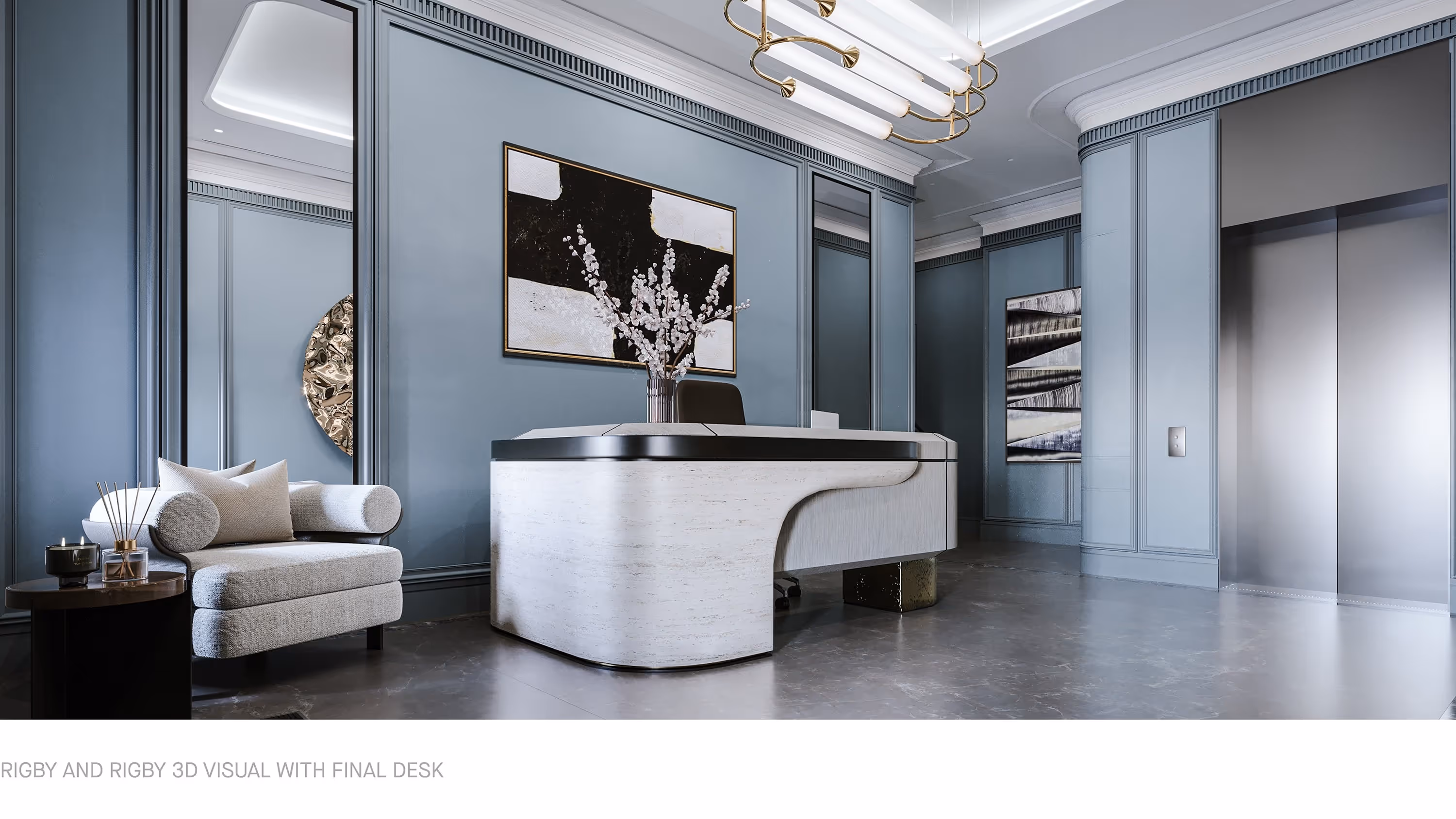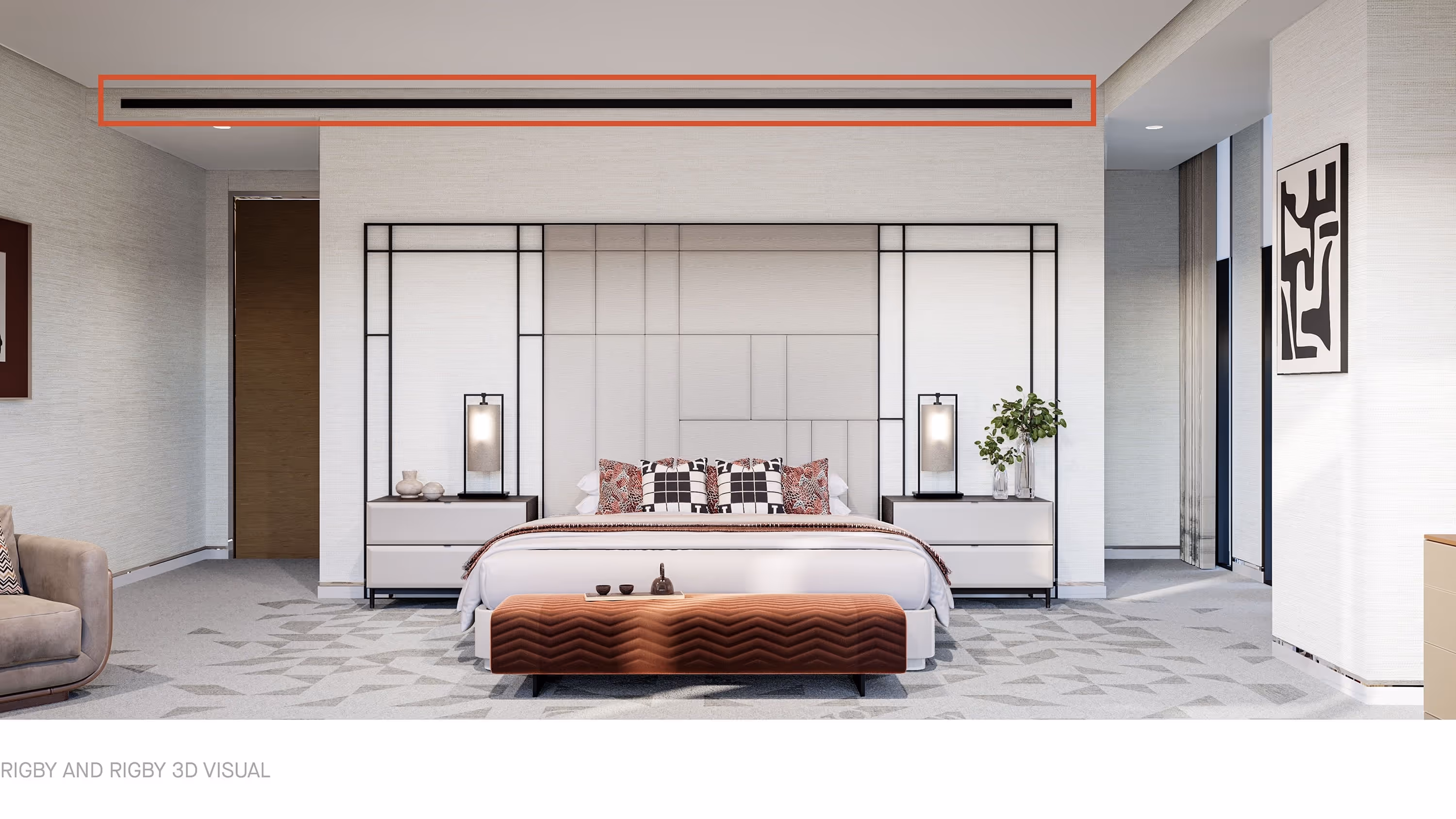 I was asked in my second 3D project with Rigby & Rigby to integrate air vents in the top of the walls. I was told they were to appear as large black empty voids, as shown here in the 3D render below. I thought, this surely can’t be accurate to what you see on site, I had never seen vents like this!It was explained to me how they worked and what benefit they had to the room in this form. Later that year I went to visit one of our projects, in the rooms they had put these same integrated vents and it all started to make sense. In certain lights, you can see the grill within and the depth of these which has since informed our visuals and allowed us to create more accurate results alongside what we find online.