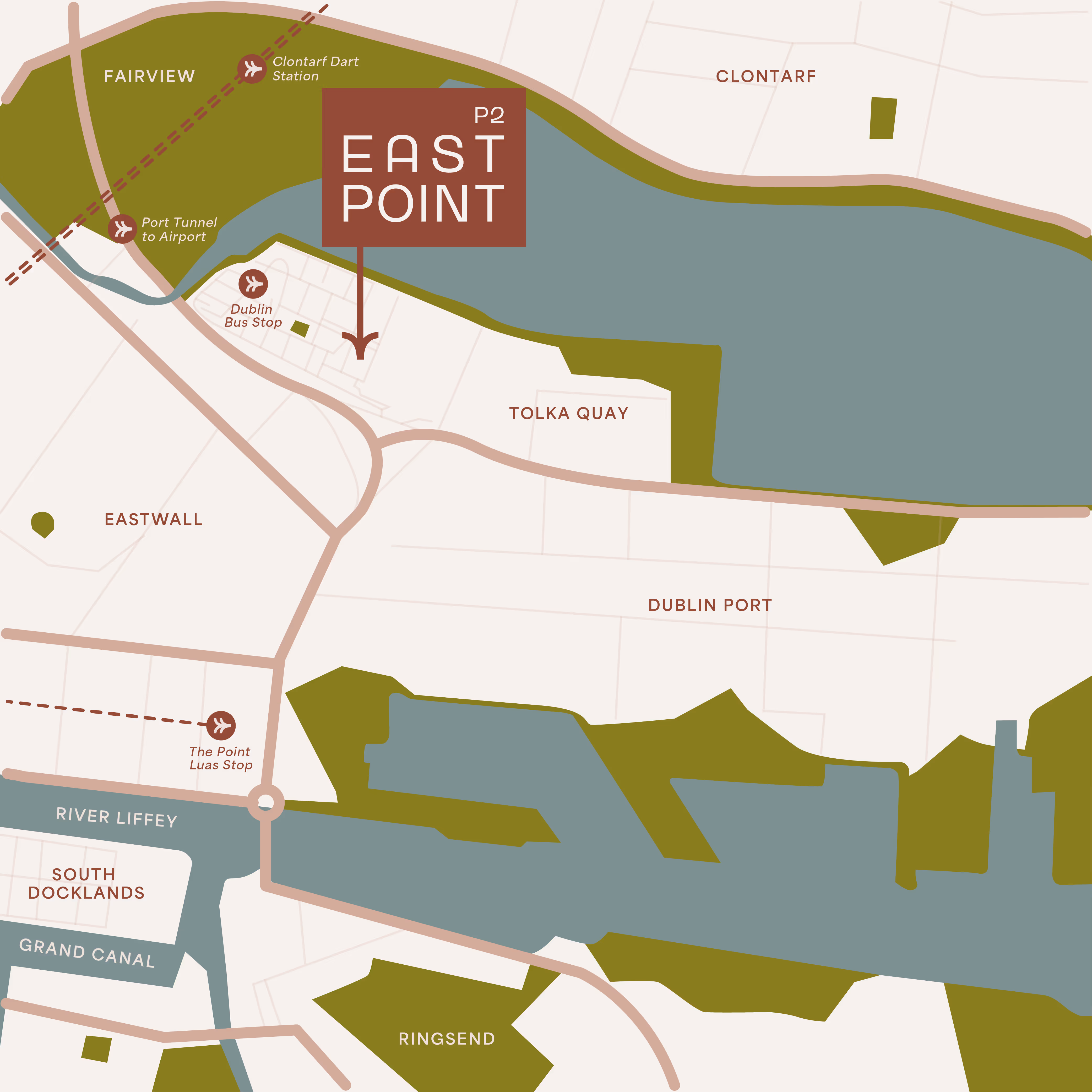 Situated between Dublin's city centre and the coast, P2 Eastpoint's strategic location offers a harmonious blend of urban energy and coastal tranquillity, reflected in its branding through the juxtaposition of edges and curves, boldness and softness, and modernity with warmth.
