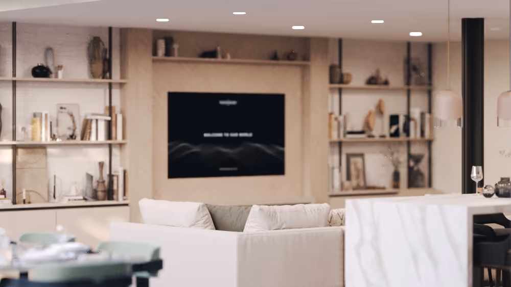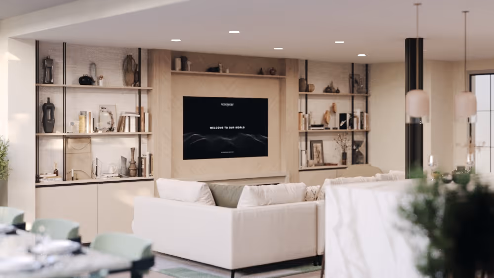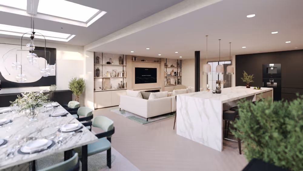 In this particular image, the sunrise’s direct sunlight enters through the left window, serving as one of the warmest points. To seamlessly connect this warmth with the coolness of the environment light on the right, interior lighting is strategically employed.