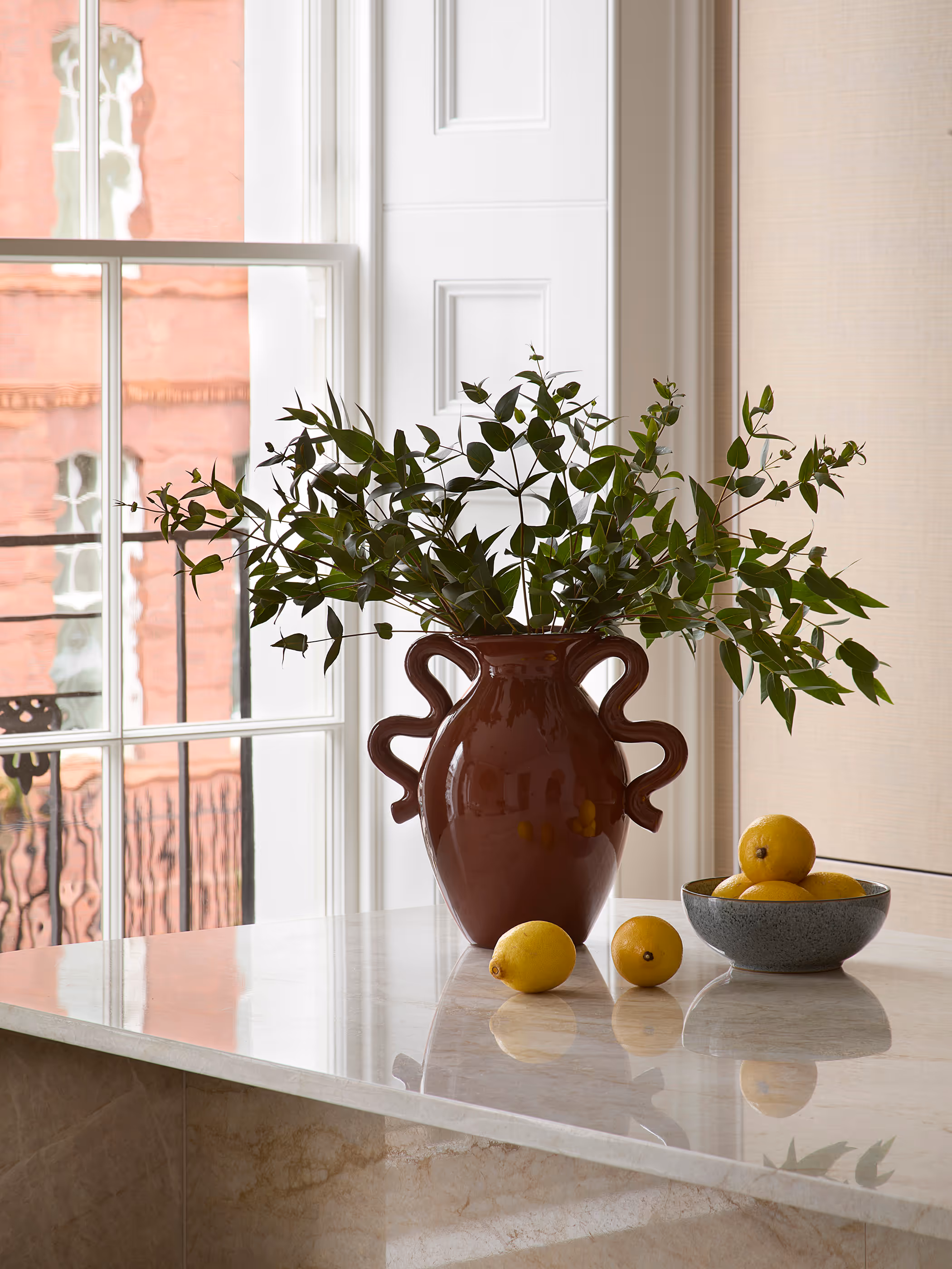 The design reflects a thoughtful balance of serene Mediterranean influences and contemporary London living. Drawing inspiration from the client’s connection to Mykonos, the design incorporates Cycladic architectural elements such as softened geometry, seen in the rounded travertine fireplaces and anodised metal arches. These features bring a sense of calm and flow to the interiors, merging cultural significance with modern luxury.