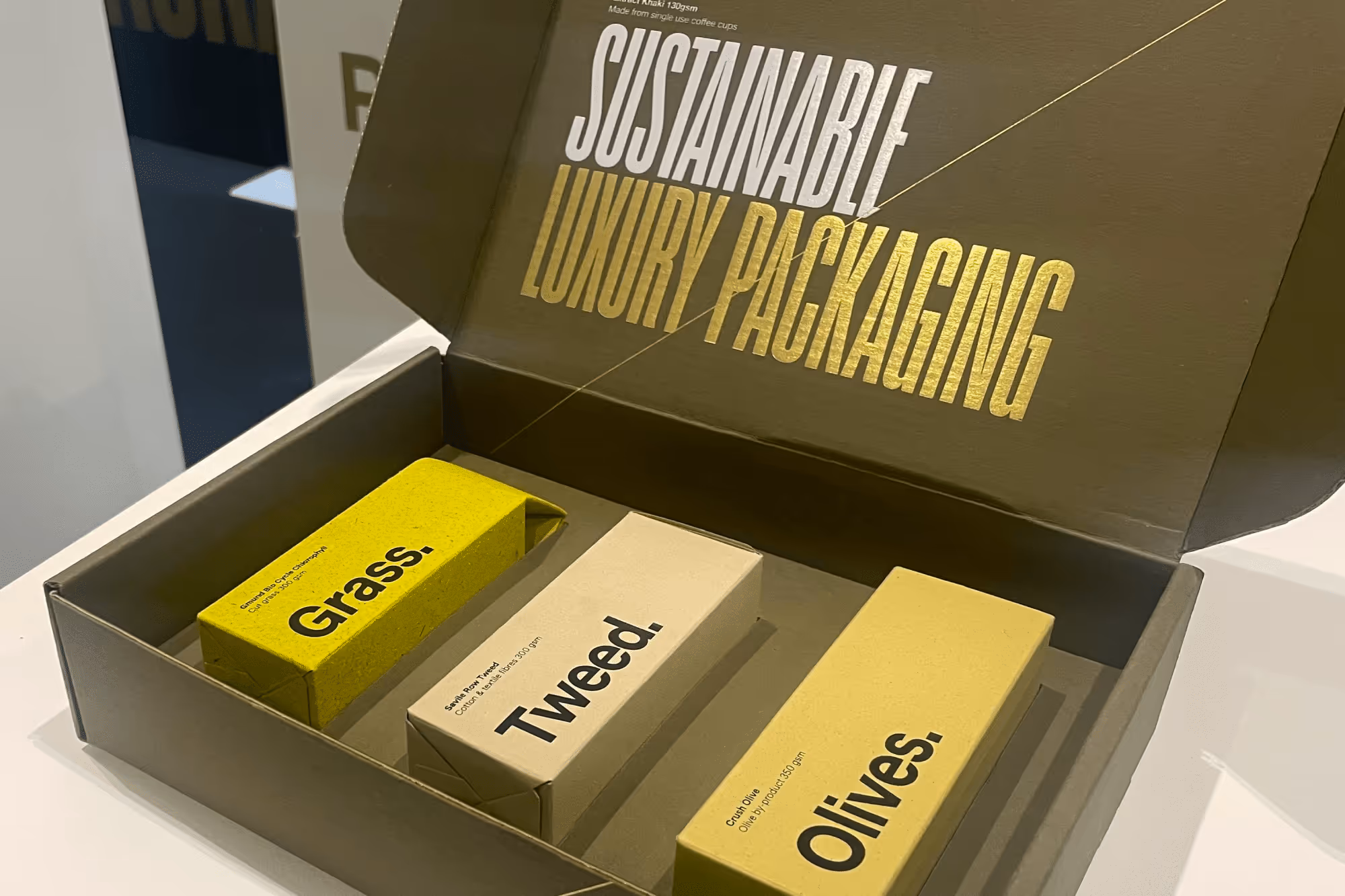 A few weeks ago, the Creative Division at Rigby & Rigby had the pleasure of attending London Packaging Week, a vibrant showcase of the latest innovations and trends in the world of packaging. The event was bursting with inspiring ideas and sustainable alternatives, all of which are set to influence our upcoming projects in exciting ways. One of the highlights for our team was discovering innovative, sustainable materials that can be used for our in-house stationery. From ribbons made of recycled polyester and cotton, to packaging envelopes lined with wool, to boxes made of grass, tweed and olives, to name but a few. We were inspired by the possibilities these alternatives offer for reducing our environmental footprint without compromising on style.