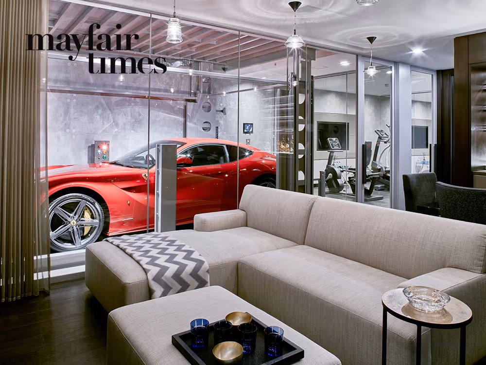 Rigby & Rigby’s speciality in designing luxury car garages has been profiled in The Mayfair Times. The article “Gadgets Go Home” looks at creating bespoke garages with commentary from Iain Johnson at Rigby & Rigby.“Discerning clients are valuing collectables more than ever. Car are continuing to be sought after, from vintage classics to modern-day luxury sports cars. Clients are seeking unique and personalised ways to store their vehicles which has resulted in the rise of installing garages at home”.“The design of a garage must respond to a range of restrictions in relation to regulations, as well as the client’s brief and space limitations.” These include ensuring garages are preserved with temperature and humidity-controlled zones, robust floor finishes, “leather-lined padded walls for door protection when opening…and focal lighting to accentuate the vehicle’s curves and personalised number plates.”The article focusses closely on Rigby & Rigby’s Project SW7 052 where Iain describes the garage designed in the mews property:“We designed a car stacker garage as a key component in the basement media room with the same level of detailing as the rest of the house and incorporated both aesthetics and functionality. The garage seamlessly transported the client’s car from ground level into the media room where it remained on display. Carefully positioning the car’s charging points into the base of the garage and an enclosed cupboard for keys ensured that the garage had a clean appearance and displayed the car like in a gallery.”