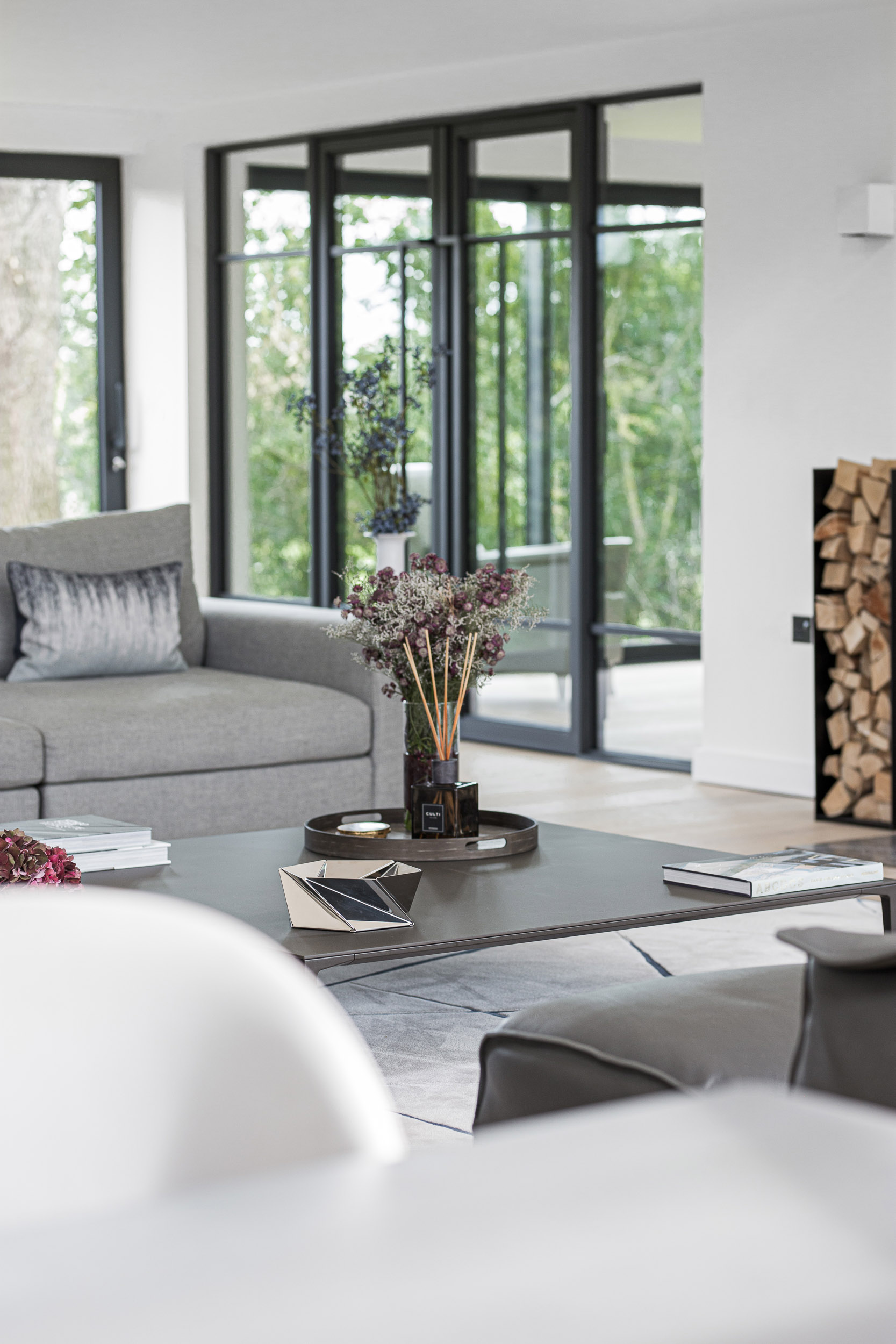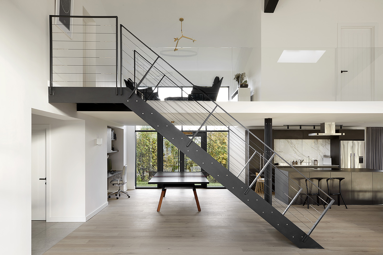 The Scandinavian interiors create a minimalist setting with a large open plan living and kitchen area with high ceilings and an outdoors entertainment area with a gym.