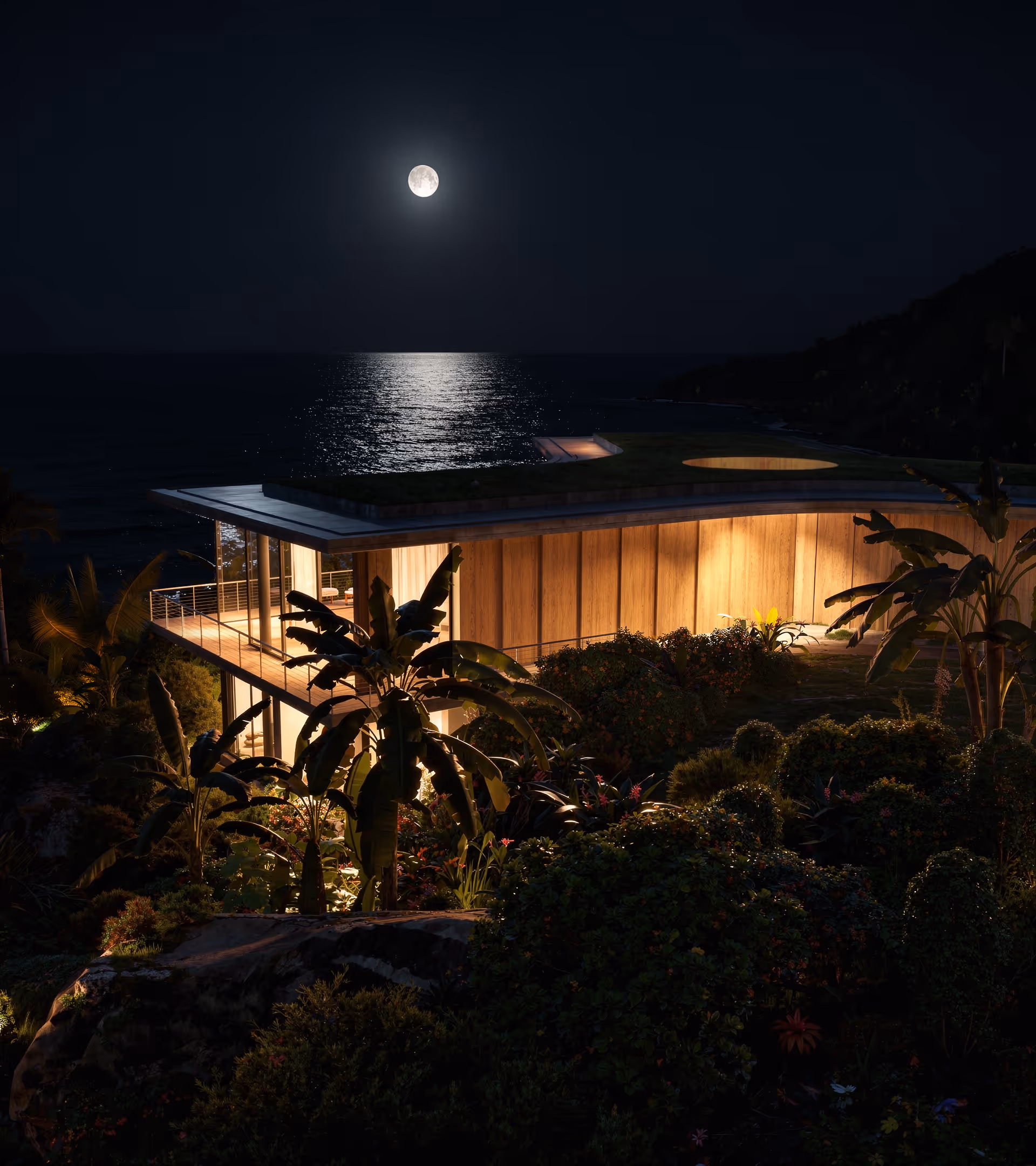 The programme is organised as a three-bedroom residence with generous living terraces and a cantilevered main volume that projects over the cliff. This cantilever not only frames the ocean views but also reduces ground disturbance, allowing the natural rock formations and vegetation to remain largely intact. A carefully integrated parking area and a stepped herb garden reinforce the villa’s quietly embedded presence within the landscape.