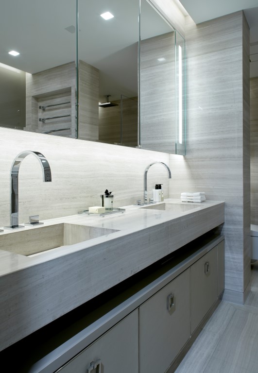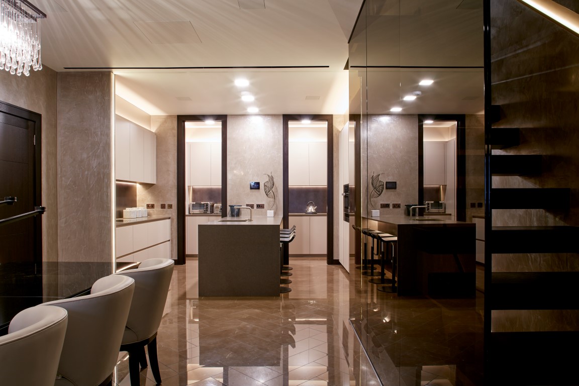 Fully maximising usable living space was the primary focus for the design team who included a basement excavation to house a car lift, gym and media suite. The contemporary interior design reflected the technology that was integrated throughout the home to give a clean and minimal aesthetic to the property.