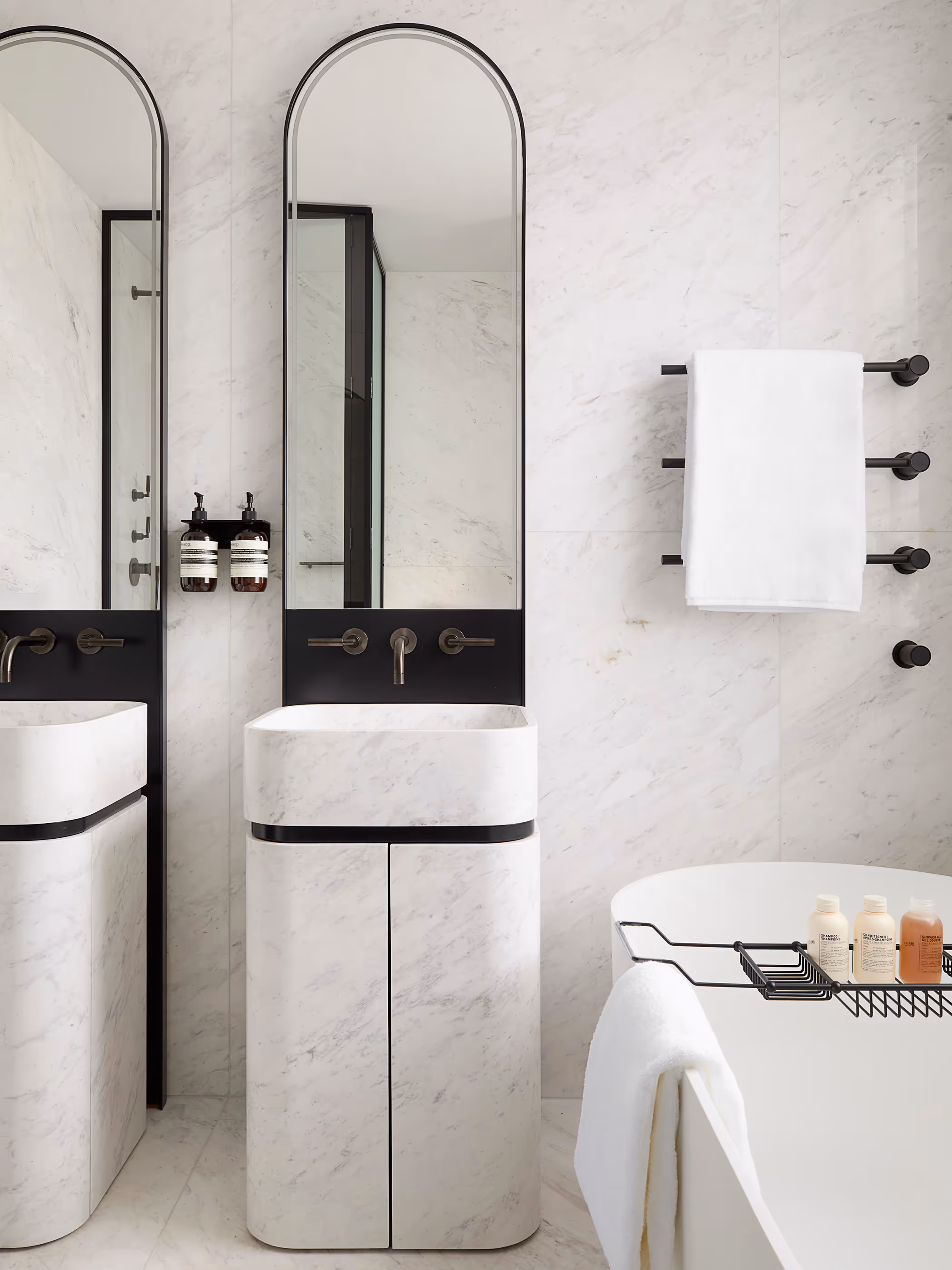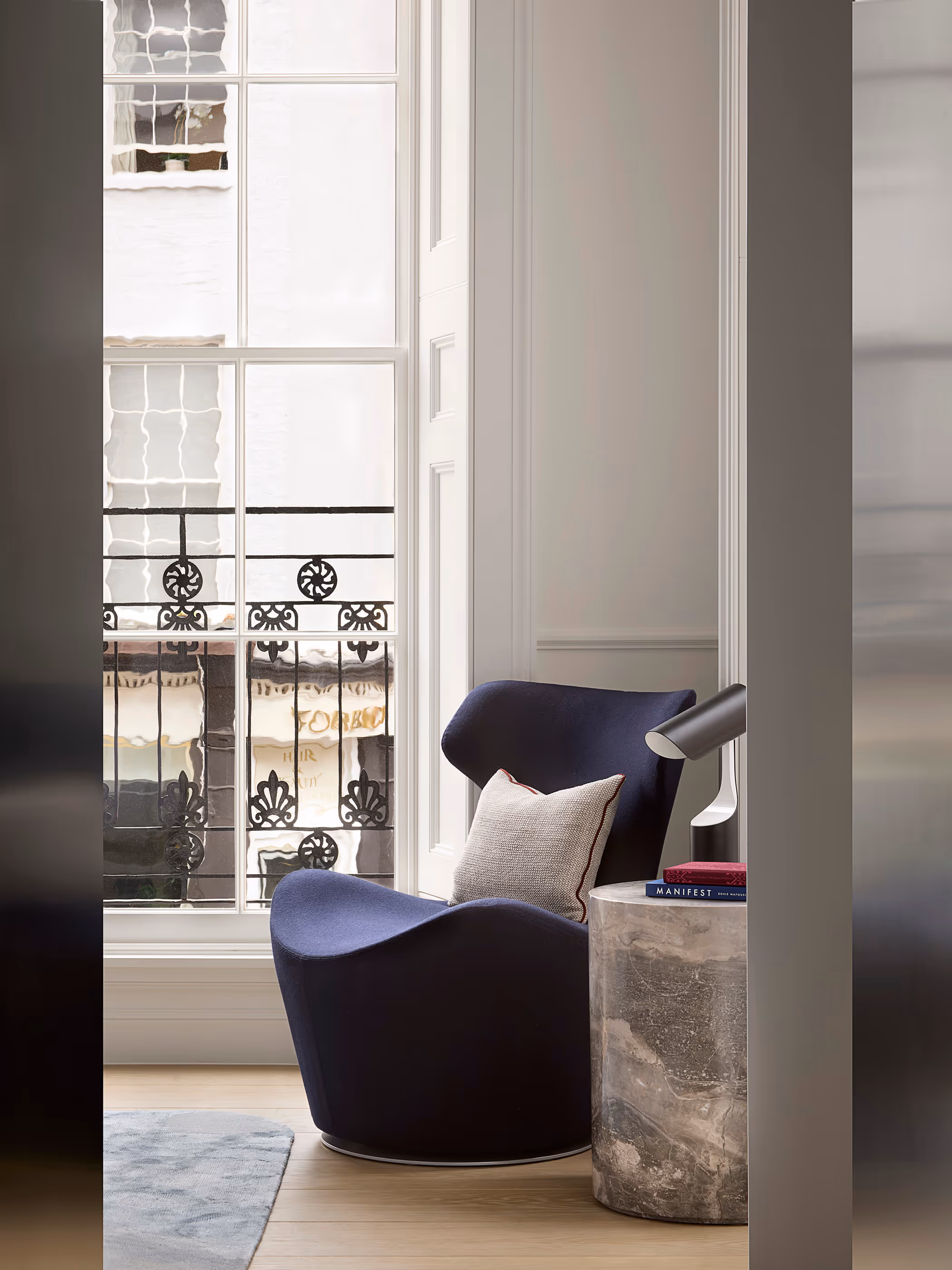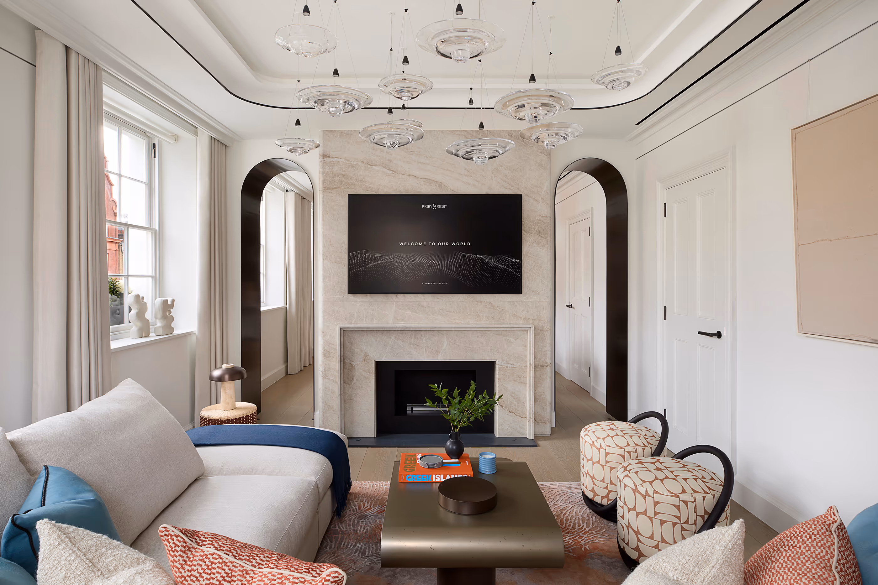 Rigby & Rigby’s design for two luxury apartments in Knightsbridge reflects a thoughtful balance of serene Mediterranean influences and contemporary London living. Drawing inspiration from the client’s connection to Mykonos, the design incorporates Cycladic architectural elements such as softened geometry, seen in the rounded travertine fireplaces and anodised metal arches. These features bring a sense of calm and flow to the interiors, merging cultural significance with modern luxury.